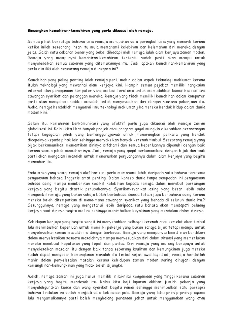 Faktor Pemilihan Kerjaya Bagi Seseorang Remaja. Era pascaperindustrian dan pascaglobalisasi yang serba mencabar akal dan minda kita telah menyumbang kepada perkembangan ekonomi pesat. Di sini disediakan himpunan contoh dan latihan karangan bahasa.